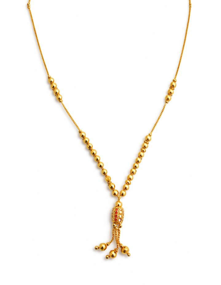 Elegant gold beaded chain design Decorative central pendant with tassel detailing Polished gold-tone finish for a rich appearance Lightweight and comfortable for all-day wear Suitable for traditional and modern outfits